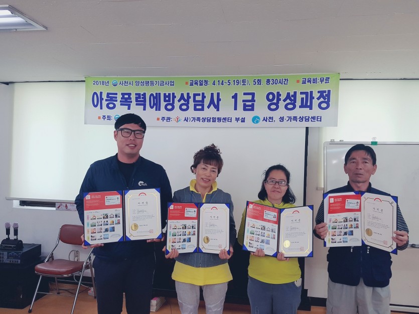 2018년 5월 19일 아동폭력예방상담사1급 자격증 취득과정 수료식 페이지 정보 작성자사천지역자활센터 작성일 20-03-04 16:53 조회 30회 댓글 0건 목록 댓글목록 0 댓글목록 등록된 댓글이 없습니다.